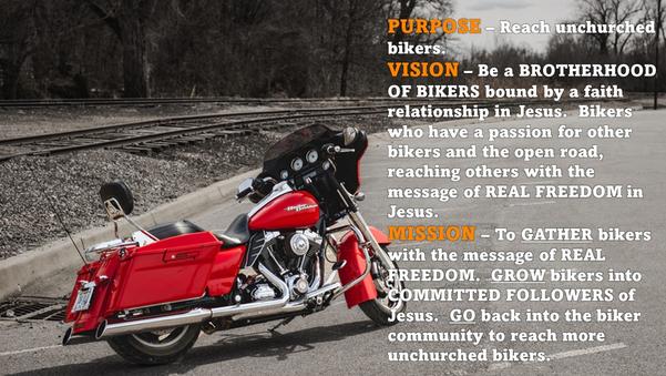 We are a brotherhood of bikers bound by a faith relationship in Jesus Christ, a passion for bikers and the freedom of the open road. Bikers reaching bikers with the message of true freedom in Jesus Christ.